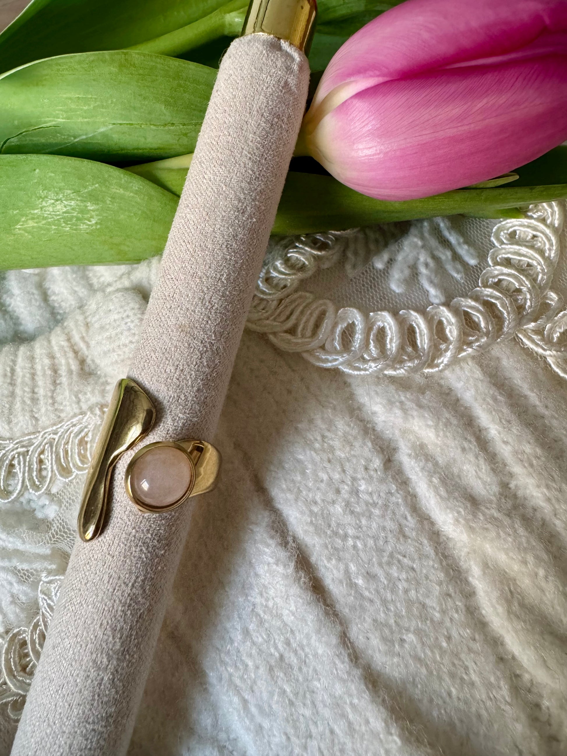 Bague asymétrique en acier inoxydable doré et pierre rose.