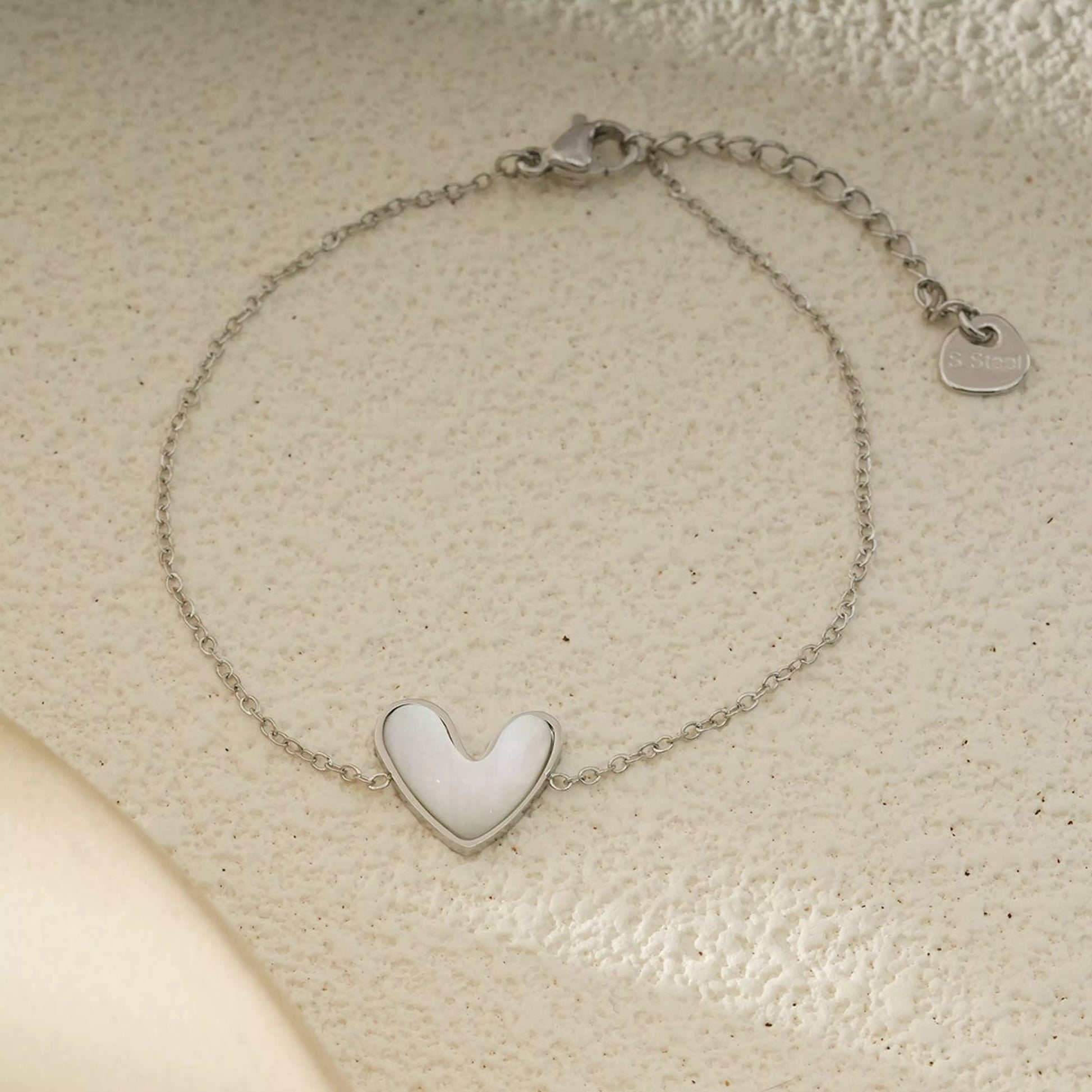 Bracelet fin en acier inoxydable argenté et coeur nacré.
